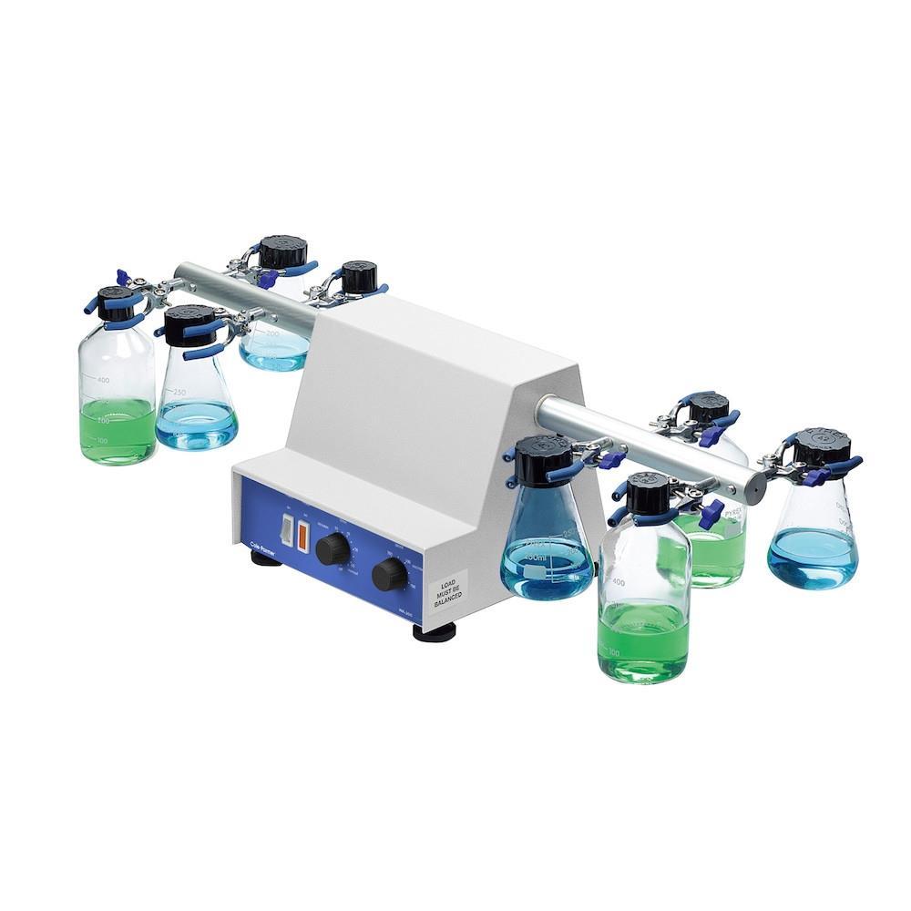 The variable-speed shaker features two side arms with adjustable clamps capable of holding eight flasks or bottles up to 500mL capacity. Use for prolonged continuous shaking or set the built-in analog timer from 10 to 60 minutes and unit automatically turns off when done. Electronic feedback controller ensures a constant speed, irrespective of load.